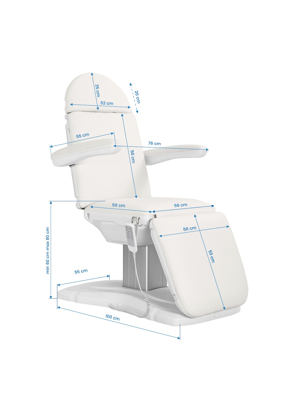 Pomocí intuitivního dálkového ovládání lze židli nastavit ve 4 rovinách - výšku, sklon opěradla, sklon podnožky a kolébku. Díky tomu lze křeslo plynule nastavit do pohodlné polohy vleže, což umožňuje pohodlně provádět na křesle ošetření obličeje i těla. Výška sedadla je nastavitelná od 60 cm do 80 cm, což umožňuje pohodlně nastavit polohu tak, aby vyhovovala výšce klienta i ošetřujícího. V plně roztaženém stavu je křeslo dlouhé přes 2 metry, což poskytuje pohodlí i vyšším uživatelům. Pro větší pohodlí lze dálkové ovládání zavěsit na úchyty umístěné po obou stranách sedadla, což usnadňuje jeho skladování a zajišťuje, že je vždy po ruce.
