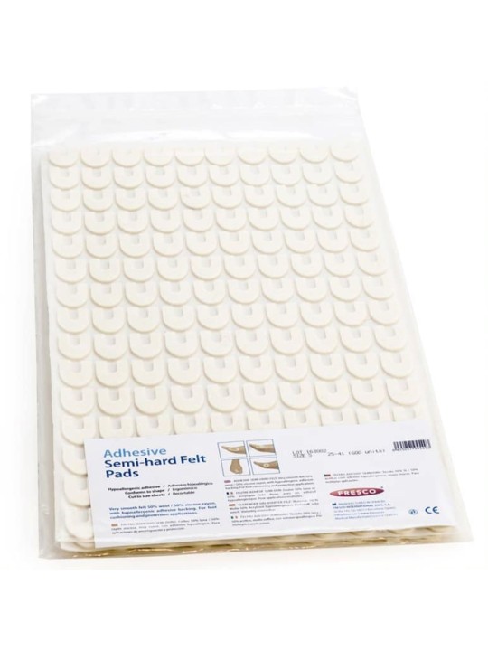 FRESCO HORSESHOE FELT PAD 2 mm Felt Horseshoe padas dydis S 20x27 mm 600 vnt. yra aukštos klasės medicinos gaminys, skirtas taškinei jautrių odos vietų - ypač aplink plaktuką, nuospaudas, nuospaudas ir nuospaudas - palengvinimui. Būdinga "U" (pasagos) forma leidžia tiksliai priglusti prie pažeistos vietos, kartu užtikrinant visišką apsaugą be papildomo spaudimo pavojaus.