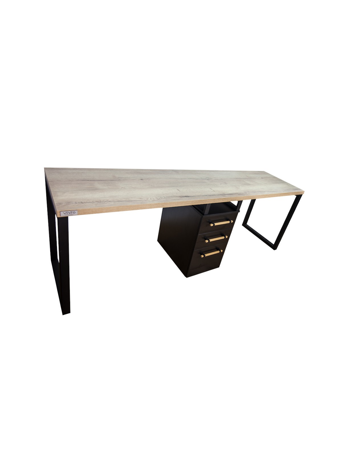 Blat został pokryty specjalną antybakteryjną powłoką stosowaną w laboratoriach – odporną na zarysowania i działanie chemii kosmetycznej. Drewnopodobne wykończenie w odcieniu dąb halifax 3303 w połączeniu z czarnym kontenerem i ręcznie wykonanymi drewnianymi uchwytami nadaje biurku loftowego, eleganckiego charakteru.