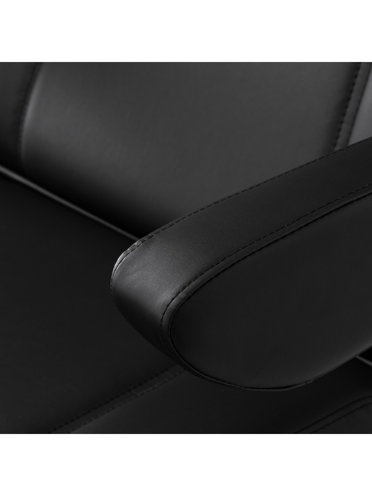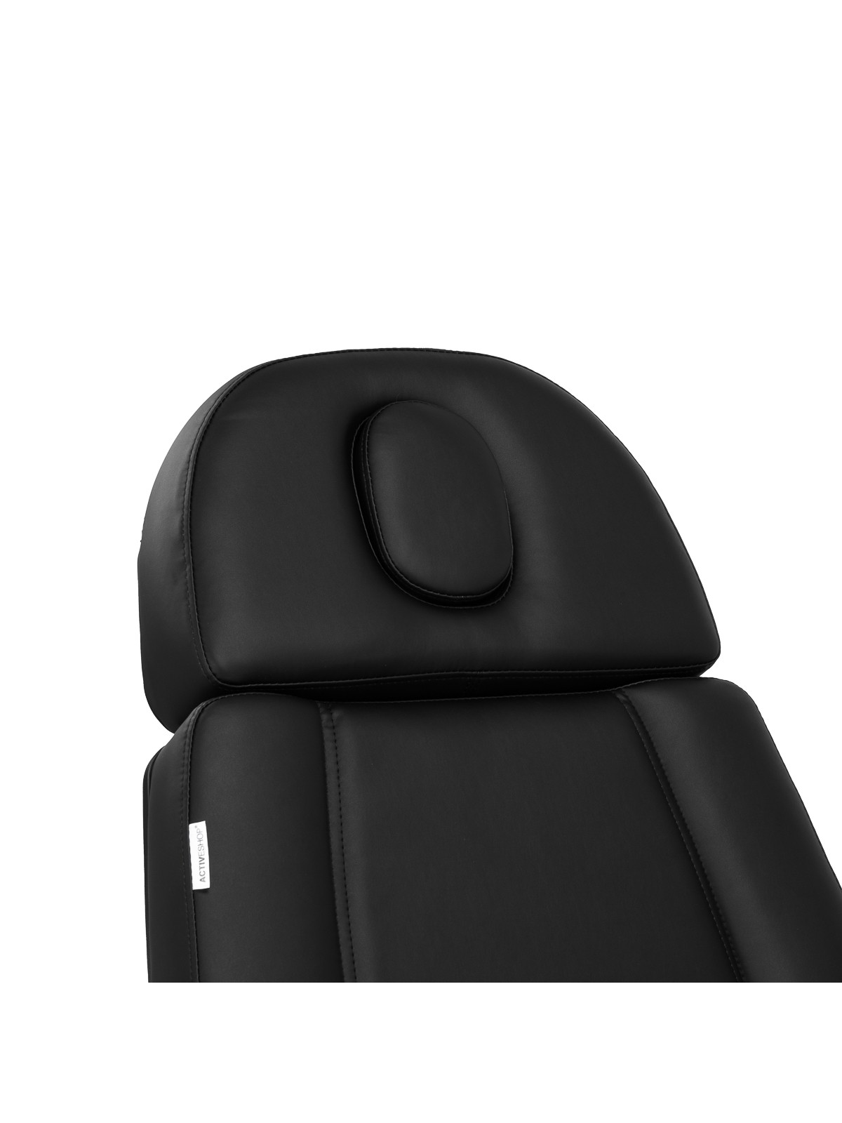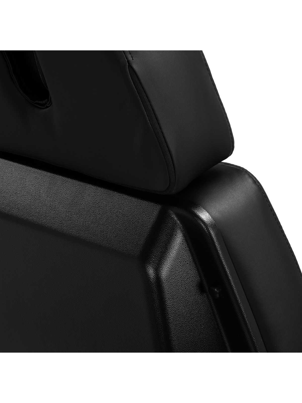 Szerokie siedzisko zapewnia wygodę nawet podczas długotrwałych zabiegów. Łatwe w demontażu, ruchome podłokietniki z możliwością obrotu w zakresie 180° ułatwiają klientowi zajęcie miejsca na fotelu oraz zapewniają swobodny dostęp osobie wykonującej usługę. Fotel wyposażono również w regulowany zagłówek, który gwarantuje stabilne podparcie głowy i dodatkowy komfort, zwłaszcza dla wyższych klientów.