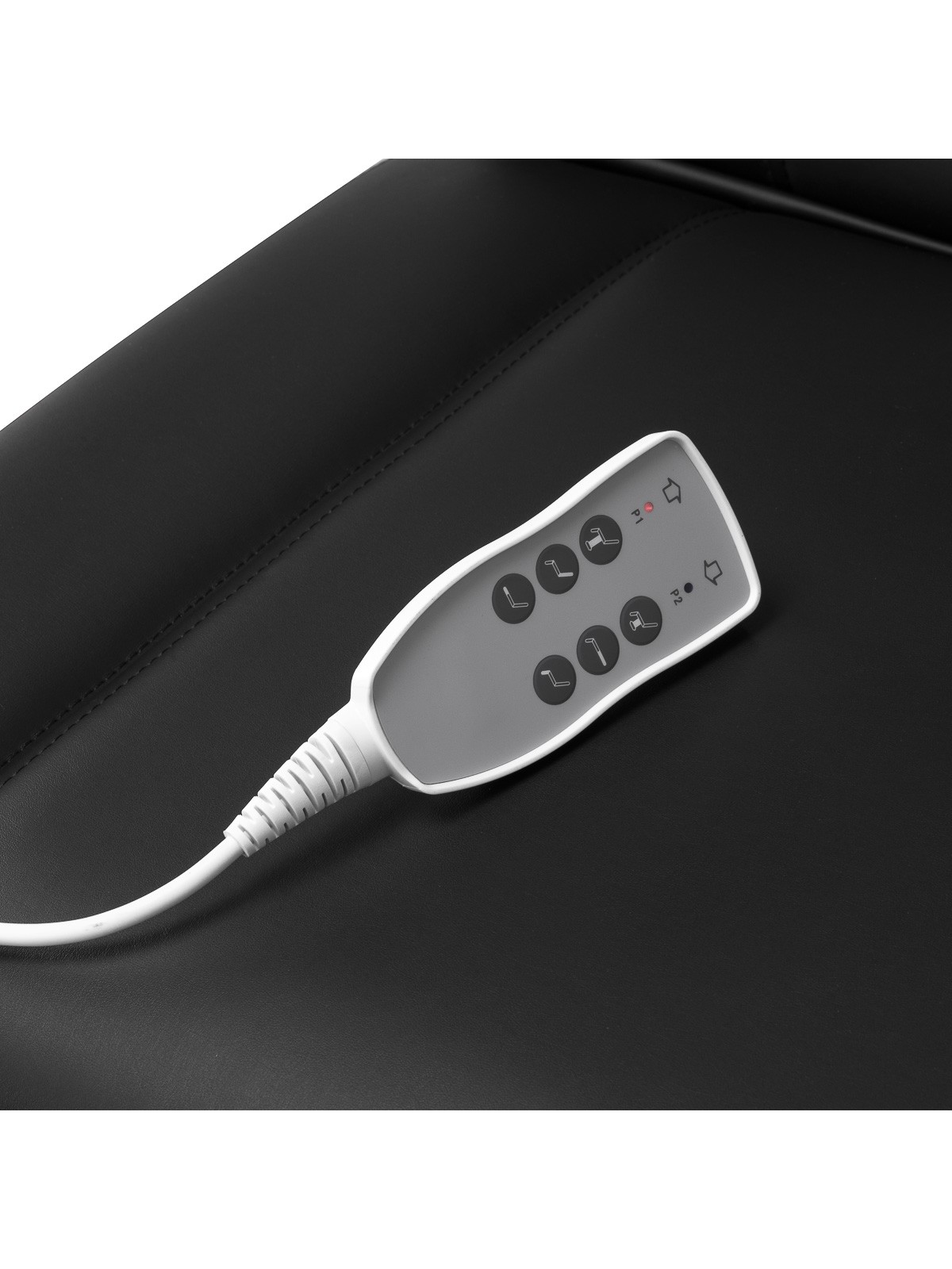 Wygodne sterowanie za pomocą pilota przewodowego pozwala na precyzyjne ustawienie fotela w trzech płaszczyznach: regulacji wysokości, kąta nachylenia oparcia oraz ustawienia podnóżka. Tak zakres regulacji umożliwia dopasowanie pozycji do rodzaju wykonywanego zabiegu – zarówno pod względem komfortu klienta, jak i ergonomii pracy specjalisty. Dla wygody użytkowania pilot można zawiesić na uchwytach umieszczonych po obu stronach siedziska.