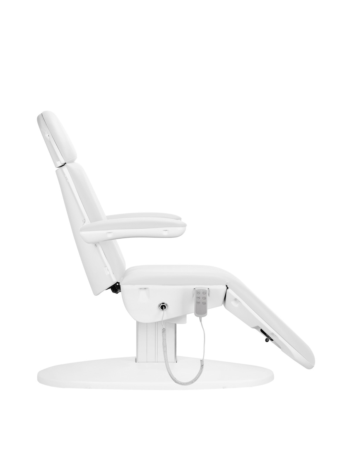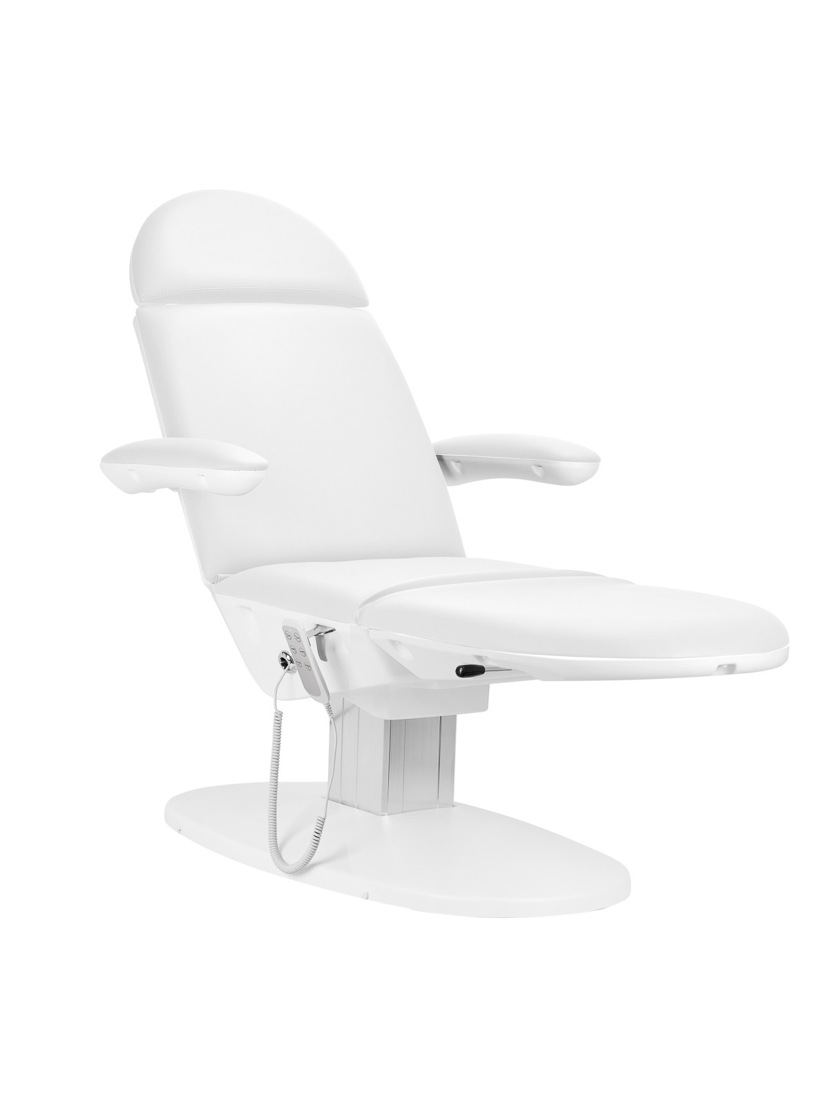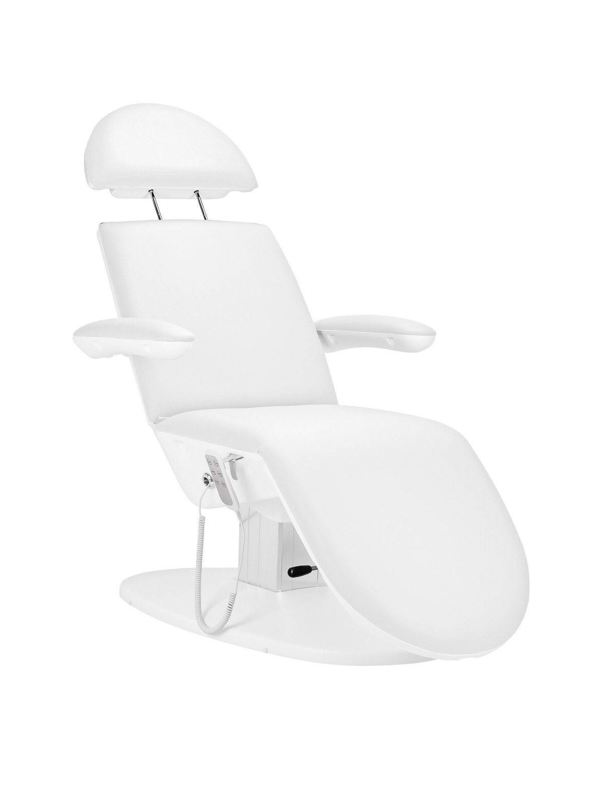 Przy pomocy łatwego w obsłudze pilota bez wysiłku można dostosować fotel w 3 płaszczyznach – posiada regulację wysokości, oparcia oraz kołyski. Dodatkowo manualna dźwignia pozwala na ustawianie kąta nachylenia podnóżka. Dzięki temu można płynnie ustawić fotel w komfortowej pozycji leżanki, co pozwala wygodnie przeprowadzać na nim zabiegi zarówno na twarz, jak i ciało. Co więcej, całkowicie rozłożony osiąga długość ponad 2,3 metra, dzięki czemu stanowi doskonałe podparcie w przypadku wyższych użytkowników. Po prawej stronie siedziska znajduje się specjalny metalowy uchwyt do wieszania pilota. Ułatwia to jego przechowywanie i sprawia, że zawsze będzie pod ręką.