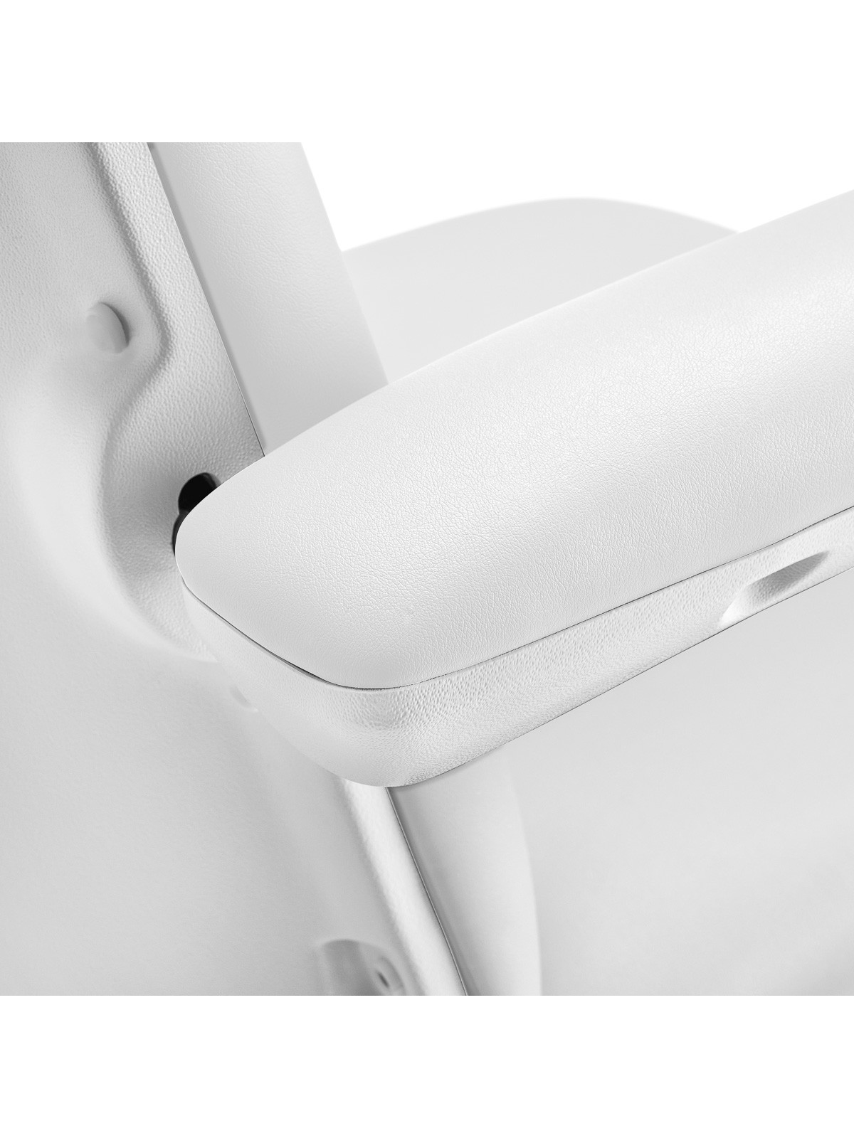 Solidna podstawa zapewnia stabilność, trwałość produktu oraz komfort pracy. Fotel wypełniony jest pianką i pokryty przyjemną w dotyku, matową imitacją skóry w odcieniach bieli. Dzięki użyciu takiego materiału, sprzęt jest odporny na wilgoć i łatwy w czyszczeniu. Opływowy kształt i prostota wykończenia sprawiają, że wygląda estetycznie i wpasuje się niemal w każde wnętrze.