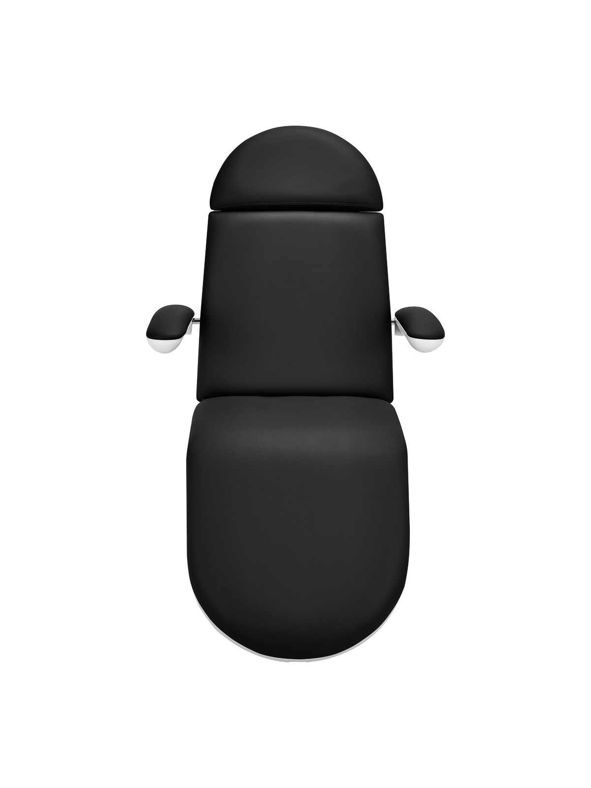 Zagłówek jest wysuwany, co pomaga dostosować sprzęt do potrzeb użytkowników o różnym wzroście, zapewniając stabilne wsparcie głowy w trakcie zabiegów. Ruchome w zakresie 180º podłokietniki ułatwiają zajęcie miejsca na siedzisku i zapewniają komfortowy dostęp osobie wykonującej zabieg. Zastosowane rozwiązania znacząco wpływają na wysoki komfort użytkowania oraz ergonomię pracy.