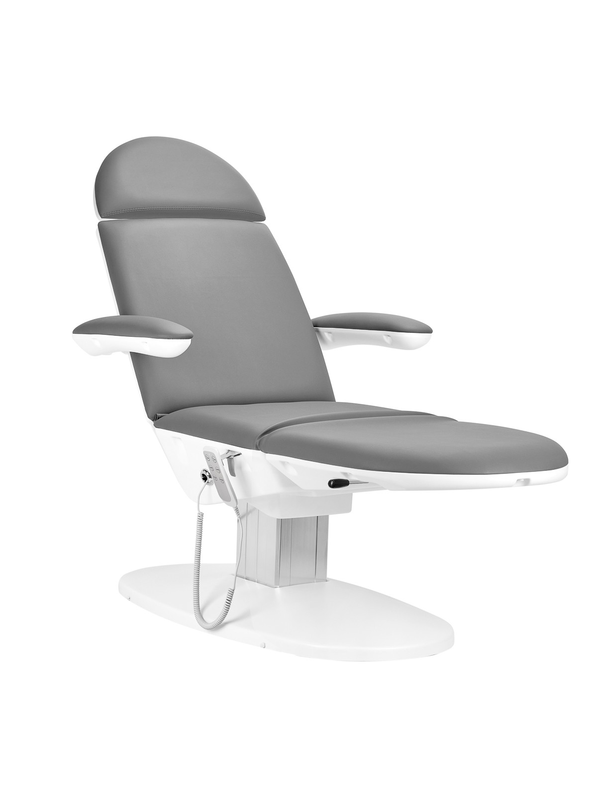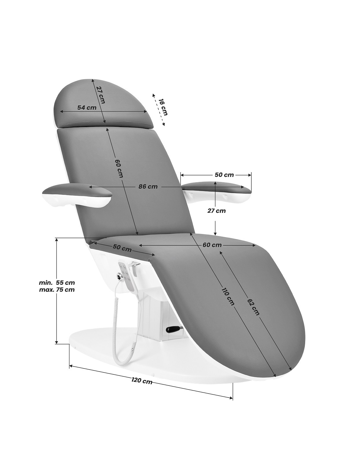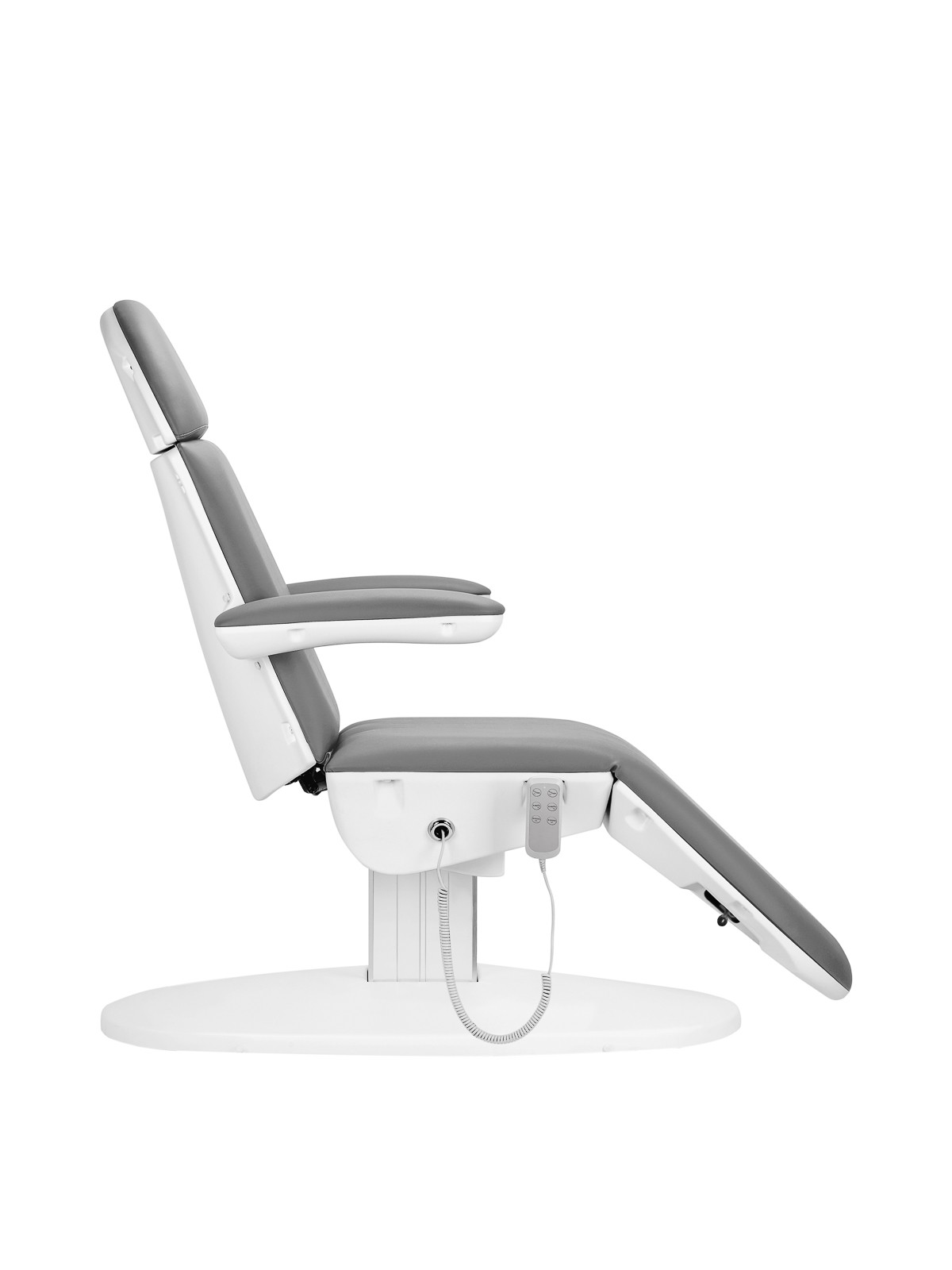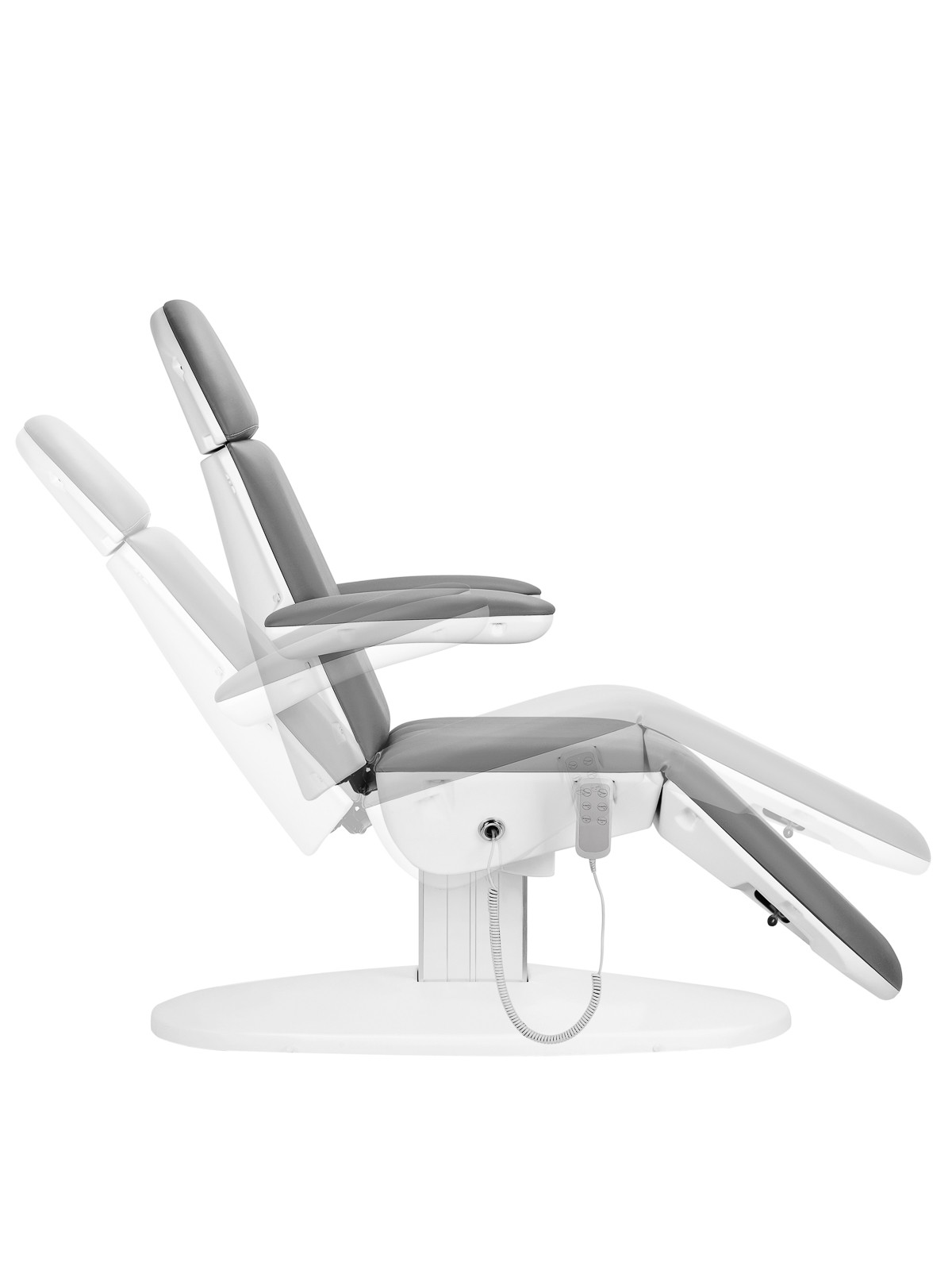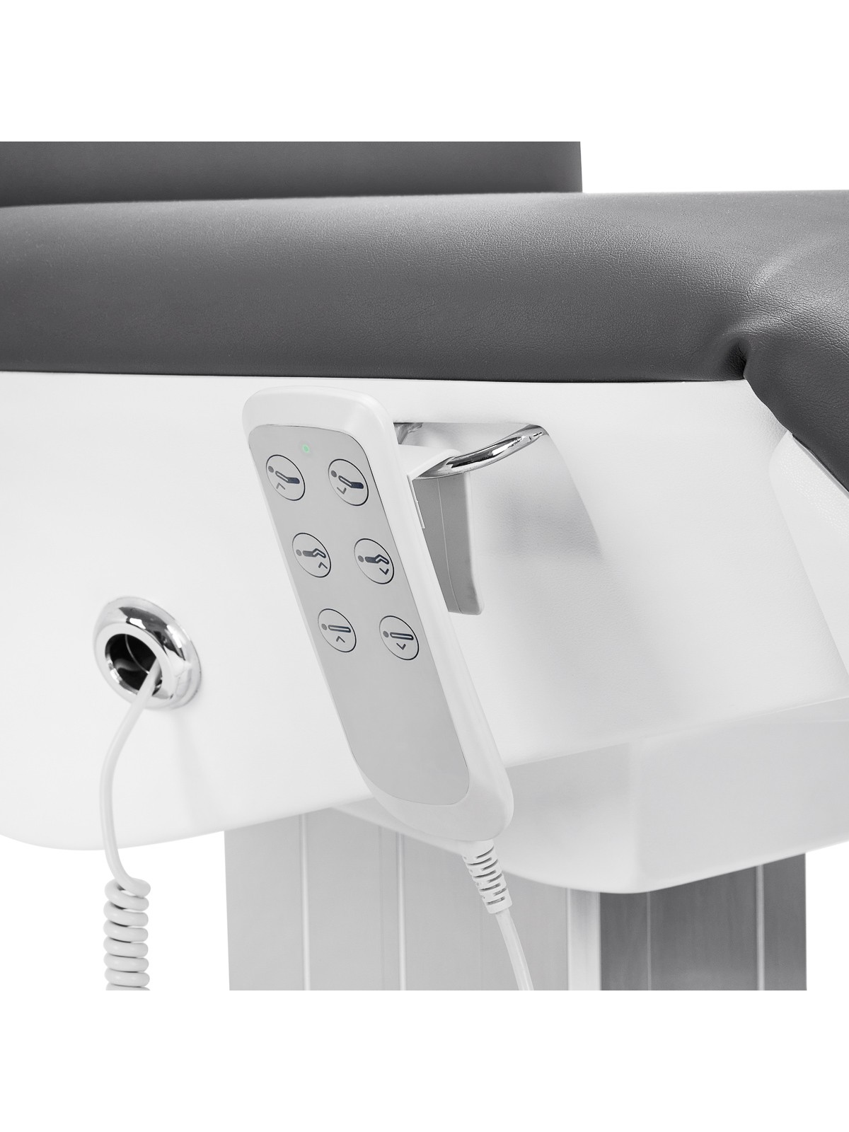Fotel kosmetyczny elektryczny Eclipse o nowoczesnym wyglądzie wyposażony jest w 3 siłowniki, które są sterowane za pomocą pilota na przewodzie oraz manualnie dostosowywany podnóżek. Łatwość regulacji pozwala na płynne ustawianie pozycji do wykonywania różnorodnych zabiegów, a minimalistyczne wykończenie sprawdzi się w niemal każdym wnętrzu.