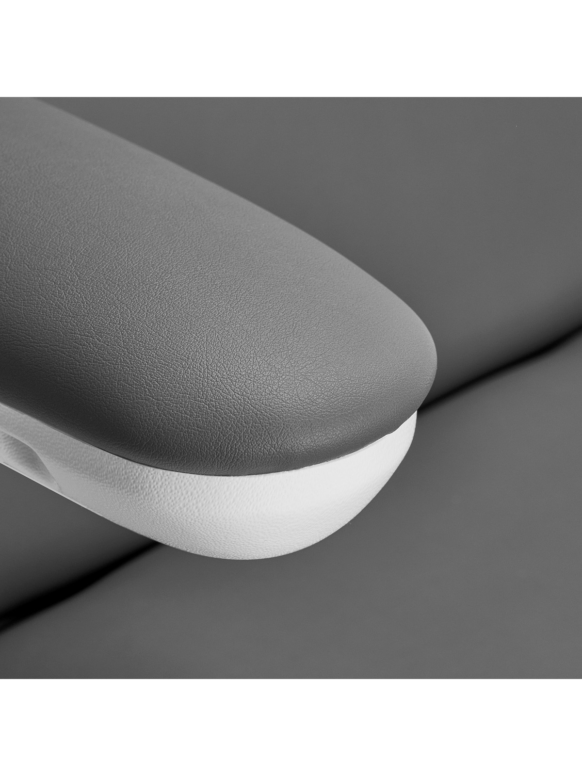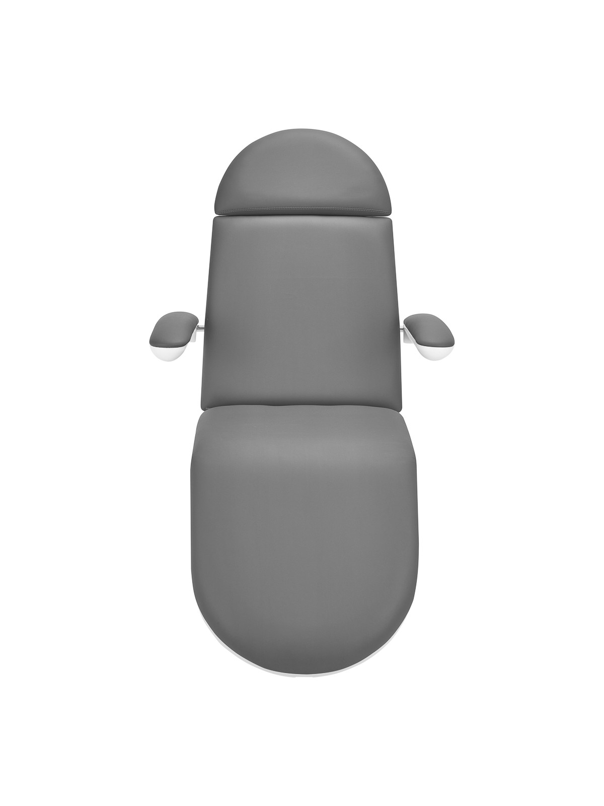 Zagłówek jest wysuwany, co pomaga dostosować sprzęt do potrzeb użytkowników o różnym wzroście, zapewniając stabilne wsparcie głowy w trakcie zabiegów. Ruchome w zakresie 180º podłokietniki ułatwiają zajęcie miejsca na siedzisku i zapewniają komfortowy dostęp osobie wykonującej zabieg. Zastosowane rozwiązania znacząco wpływają na wysoki komfort użytkowania oraz ergonomię pracy.
