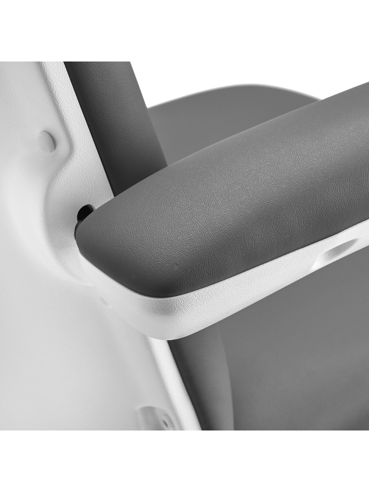 Solidna podstawa zapewnia stabilność, trwałość produktu oraz komfort pracy. Fotel wypełniony jest pianką i pokryty przyjemną w dotyku, matową imitacją skóry w odcieniach szarości. Dzięki użyciu takiego materiału, sprzęt jest odporny na wilgoć i łatwy w czyszczeniu. Opływowy kształt i prostota wykończenia sprawiają, że wygląda estetycznie i wpasuje się niemal w każde wnętrze.