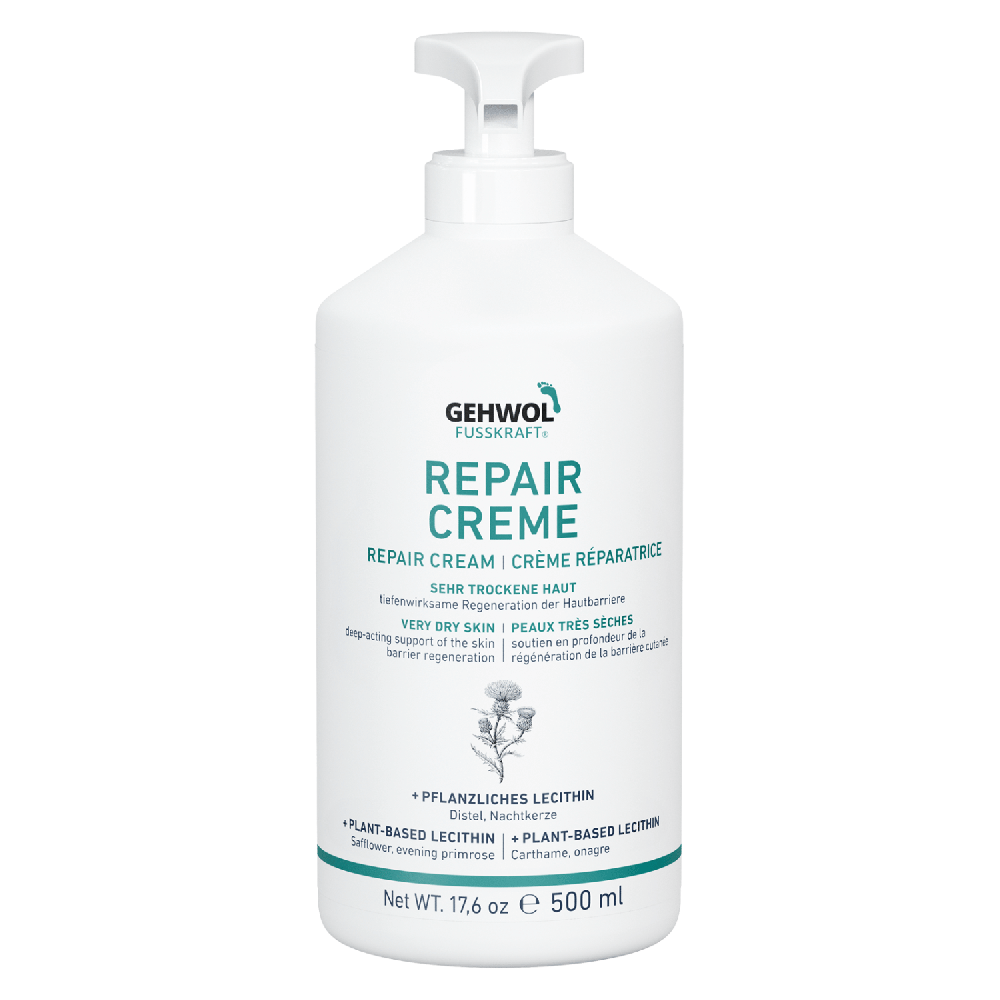 GEHWOL Fusskraft Repair Creme - 500 ml to zaawansowany krem regenerujący stworzony specjalnie dla osób zmagających się z problemem bardzo suchej, popękanej i zniszczonej skóry stóp. Bogata formuła, zawierająca roślinną lecytynę oraz starannie dobrane składniki aktywne, przywraca skórze gładkość, miękkość oraz zdrowy wygląd. Regularne stosowanie poprawia nawilżenie, redukuje szorstkość oraz wspomaga proces gojenia drobnych pęknięć.