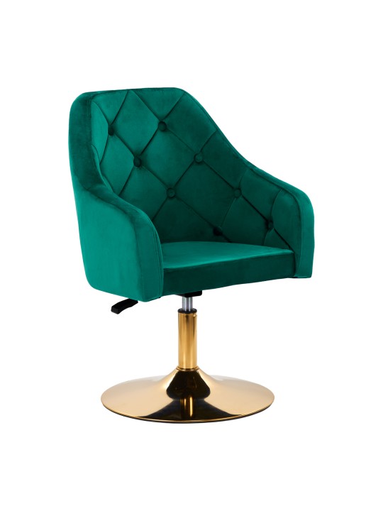 Ciekawy design nadaje krzesłu wyjątkowego charakteru. Przyjemne w dotyku, welwetowe obicie w odcieniach zieleni wraz z ozdobnym pikowaniem sprawiają, że będzie ozdobą każdego wnętrza. Stabilna, okrągła podstawa w odcieniach złota dodaje elegancji, idealnie komponując się z welwetem. Estetyka wykonania, komfortowo osadzone podłokietniki, ergonomicznie wyprofilowane oparcie i estetyczne pikowanie sprawiają, że krzesło spełni wymagania nawet najbardziej wymagających użytkowników.