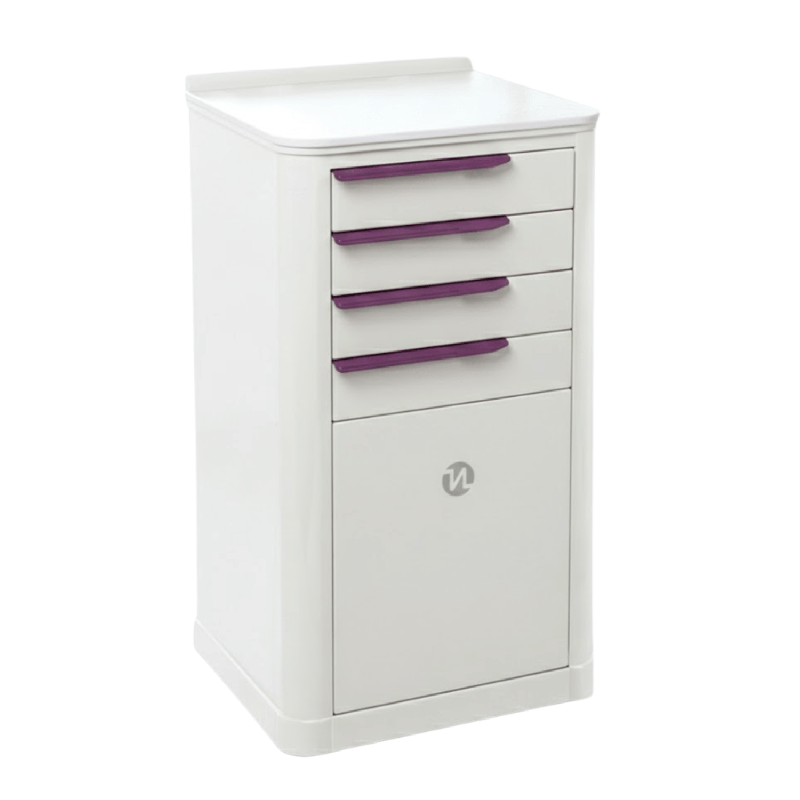 Cztery pojemne szuflady oraz dolna szafka zamykana drzwiami umożliwiają logiczne rozdzielenie narzędzi, materiałów jednorazowych i preparatów. Wszystko znajduje się dokładnie tam, gdzie powinno – bez chaosu, bez strat czasu, bez zbędnych ruchów.
